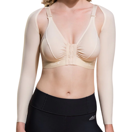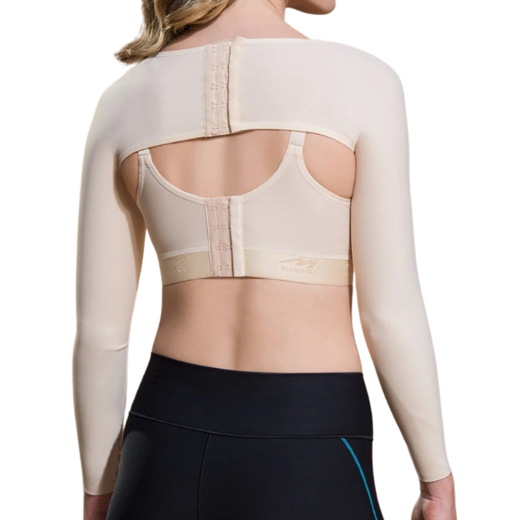 Ermarnar ná yfir allan handlegginn niður að úlnlið. Kræktar saman á baki með þrjár stillingar á krækjum.