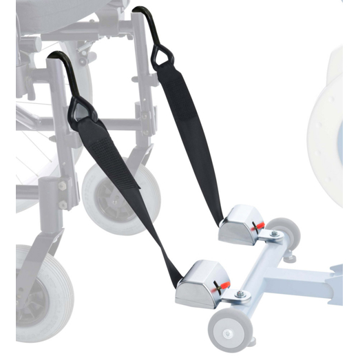 Veltivarnarbeltin eru tryggilega fest á fremri stuðningsfót Thera-Trainer Tigo. Því næst eru beltin dregin upp og festa stólinn með krækjunum sem eru á þeim.