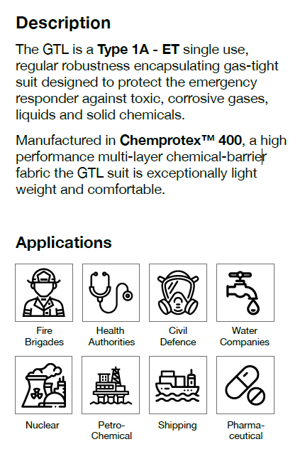 Eiturefnagalli GTL Gas tight suit Þessi eiturefnagalli er einnota. Hann er notaður yfir súrefniskút og maska.Gallinn er gasþéttur með áföstum hönskum.Mælt er í Hazmax FPA-stígvélunum.